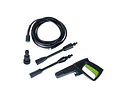 Auto Stop, detiene el equipo cuando se suelta el gatillo de la lanza Fusible térmico incorporado, protege el equipo de sobrecarga de trabajo y baja tensión Diseño ultramoderno y compacto Temperatura máxima de agua 60ºC Incluye manguera de 5 metros